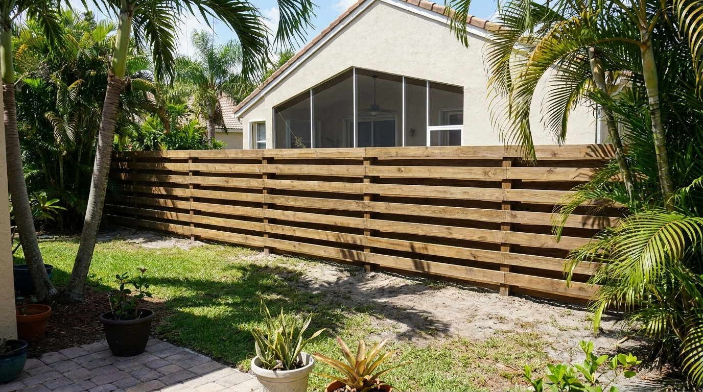 Experience the privacy and aesthetic appeal of Board-on-Board Fencing from Ace Fence. This unique style of wood fencing is designed for those who value both seclusion and elegance in their outdoor spaces. Board on Board Fencing is constructed with a coinciding pattern of vertical slats, which ensures no visible gaps as the wood naturally contracts and expands. This design enhances privacy and provides a robust, wind-resistant structure. Ideal for homeowners in South Florida looking for a durable and attractive fencing option, our Board-on-Board fences are crafted from high-quality wood that withstands the local climate conditions, ensuring long-term durability and minimal maintenance. At Ace Fence, our expert team of wooden fence contractors specializes in custom installations, ensuring that every fence is perfectly aligned and professionally finished.